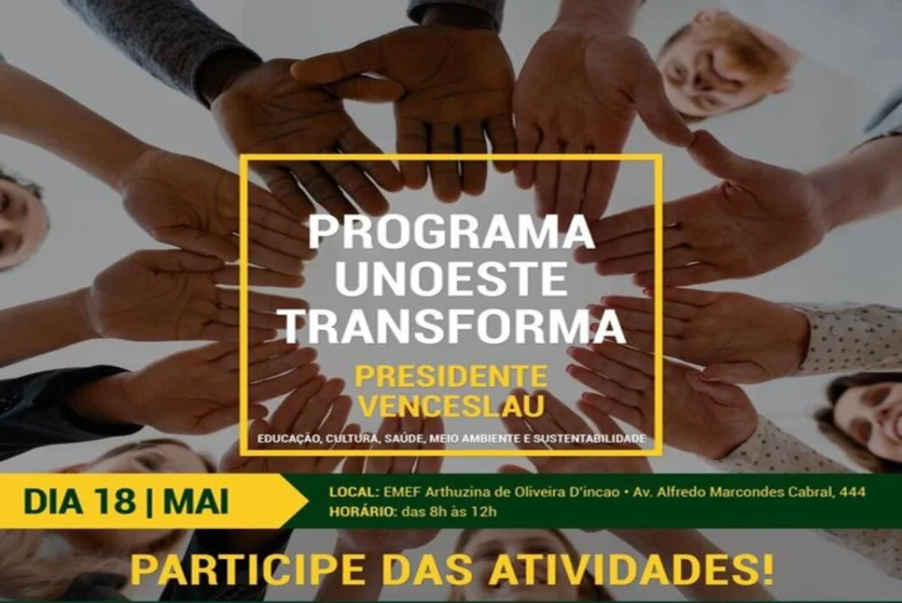 'Unoeste Transforma'; Evento gratuito com diversas atividades, ações culturais e atendimentos de saúde, acontece agora em Escola Municipal de Venceslau; Das 8h às 12h! - Integração Regional
