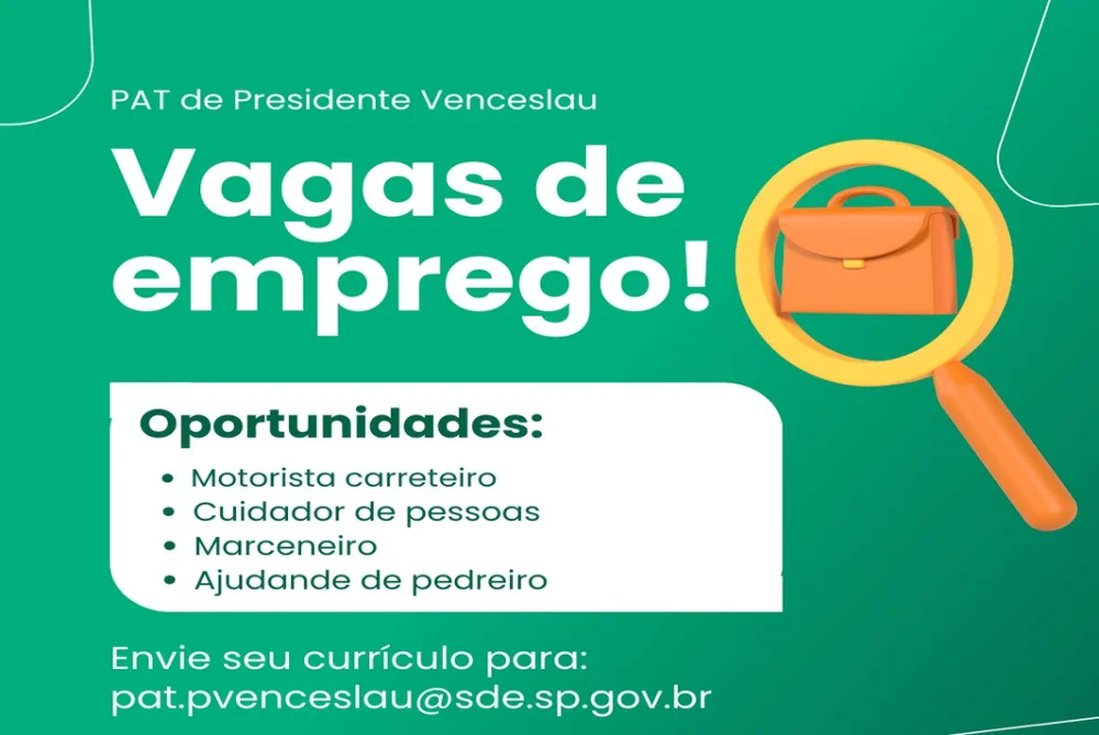 O Posto de Atendimento ao Trabalhador (PAT) de Presidente Venceslau atualizou as vagas de emprego disponíveis para a cidade e região. Oportunidades são ofertadas em quatro funções diferentes.